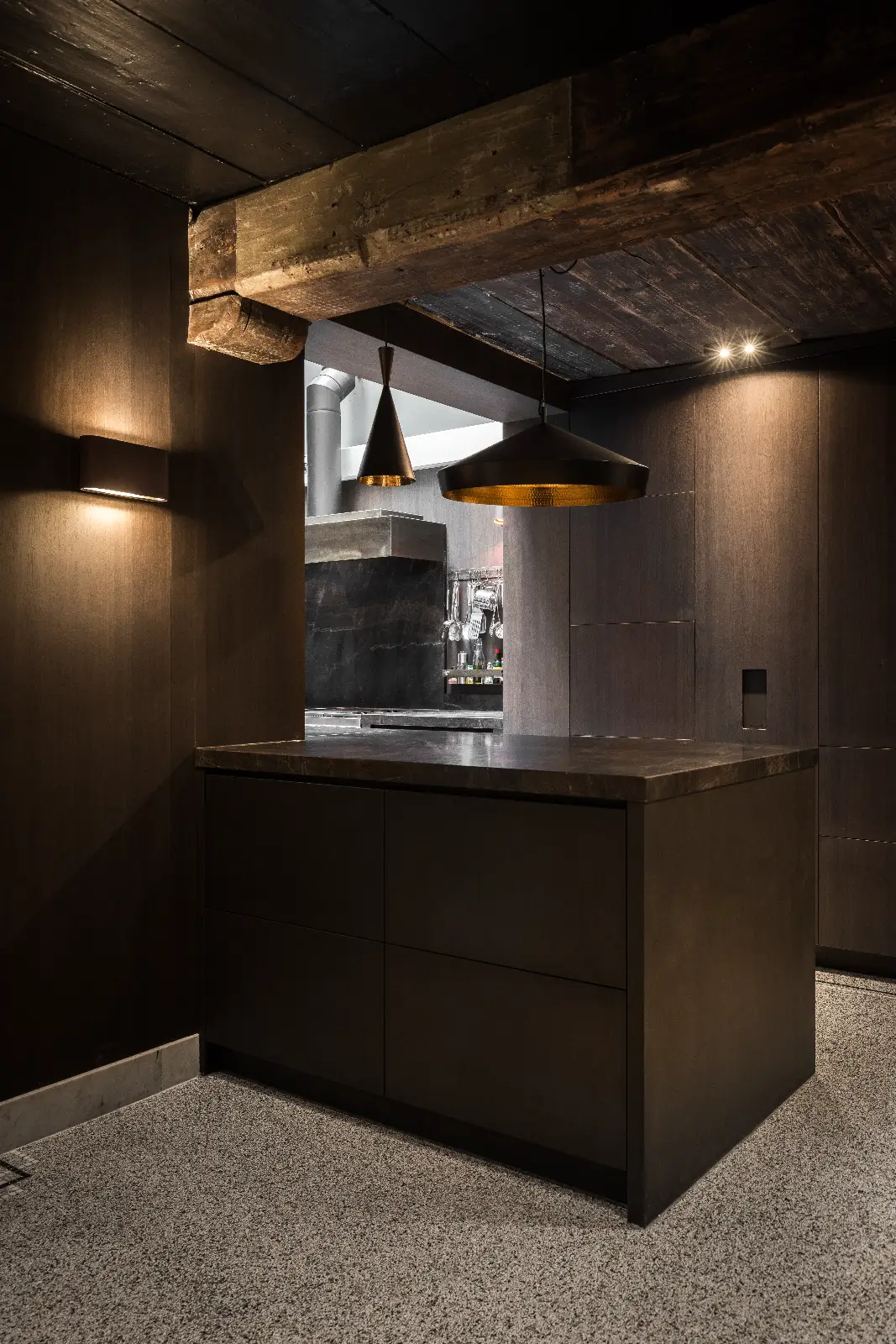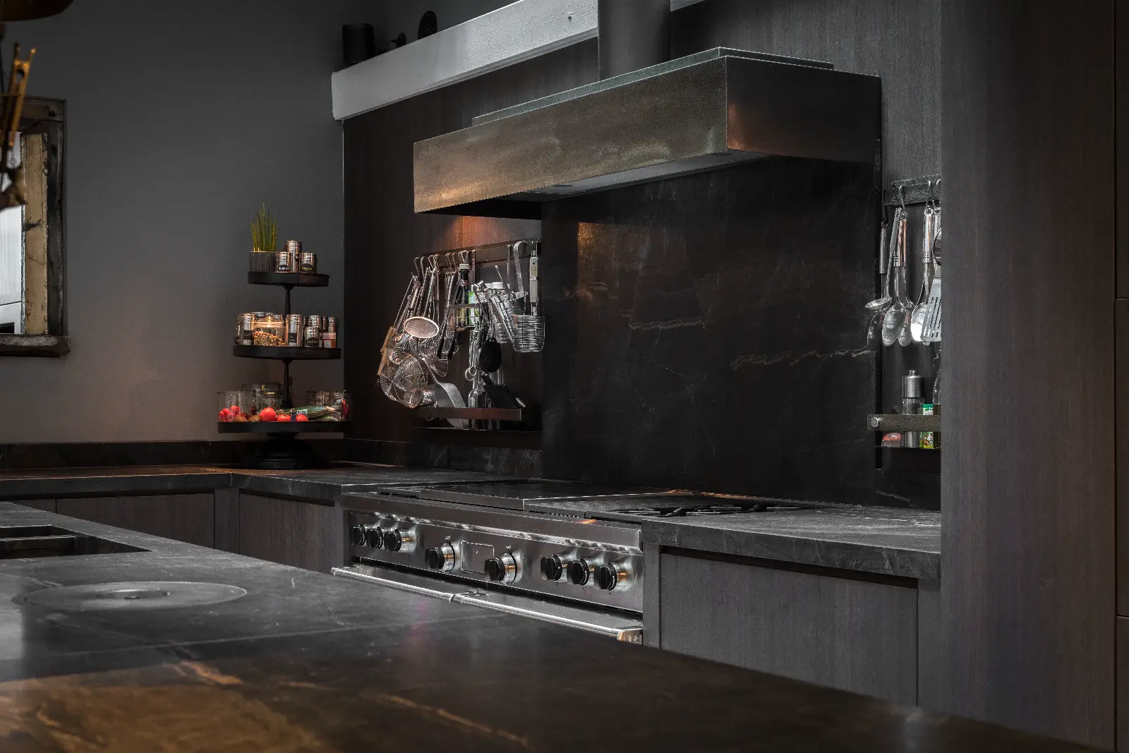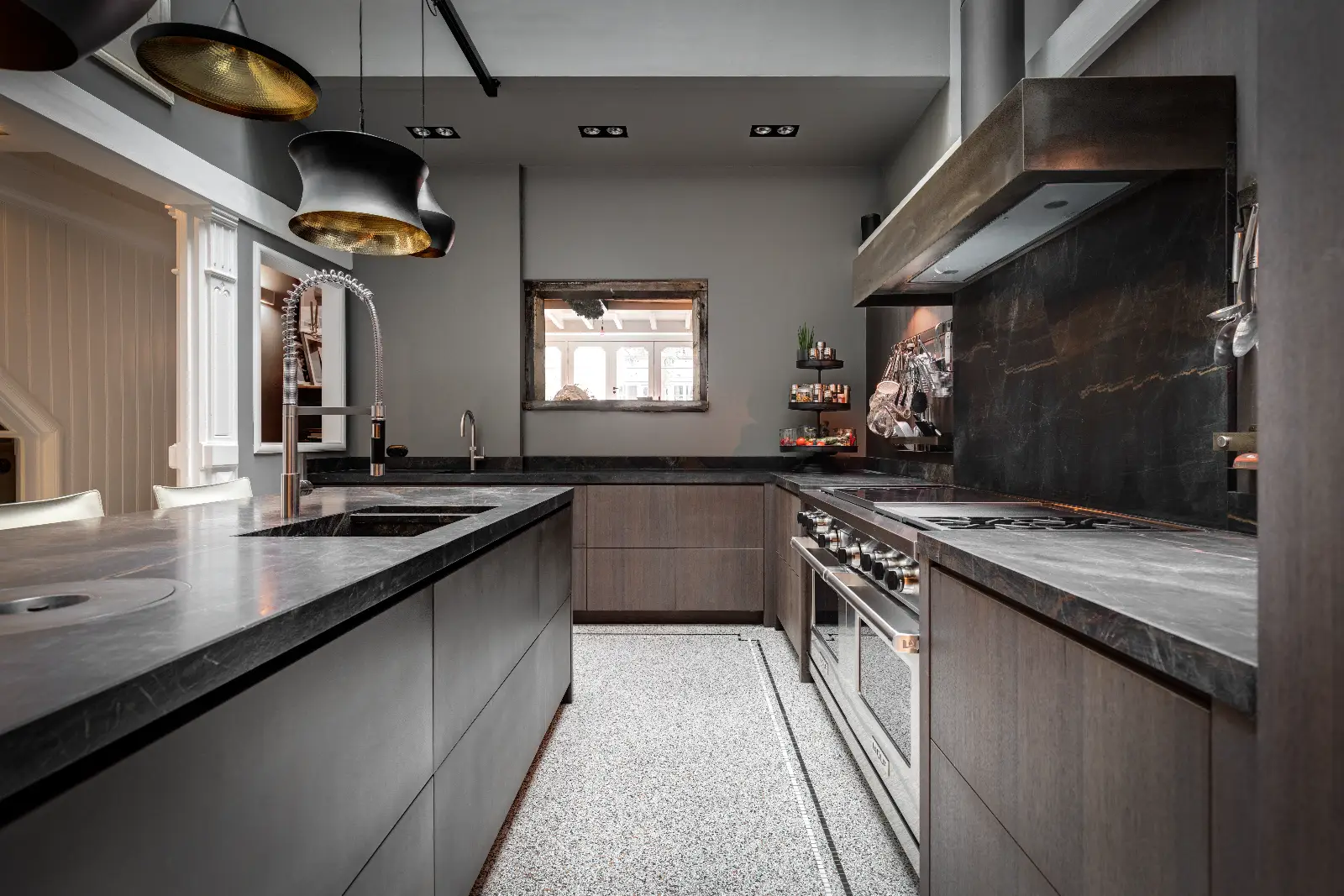 De verlichting in deze donker eiken keuken speelt een cruciale rol in het creëren van de juiste sfeer. We hebben gekozen voor verlichting van topmerken zoals Jacco Maris, Studio Italia en Brand van Egmond, die prachtig licht werpen op zowel de keuken als het Arte en Élitis-behang dat we hebben toegepast. Geniet van een moment van rust bij de Spartherm kachel, terwijl het lichtspel en de warmte de ruimte vullen. Dat is pas luxe.