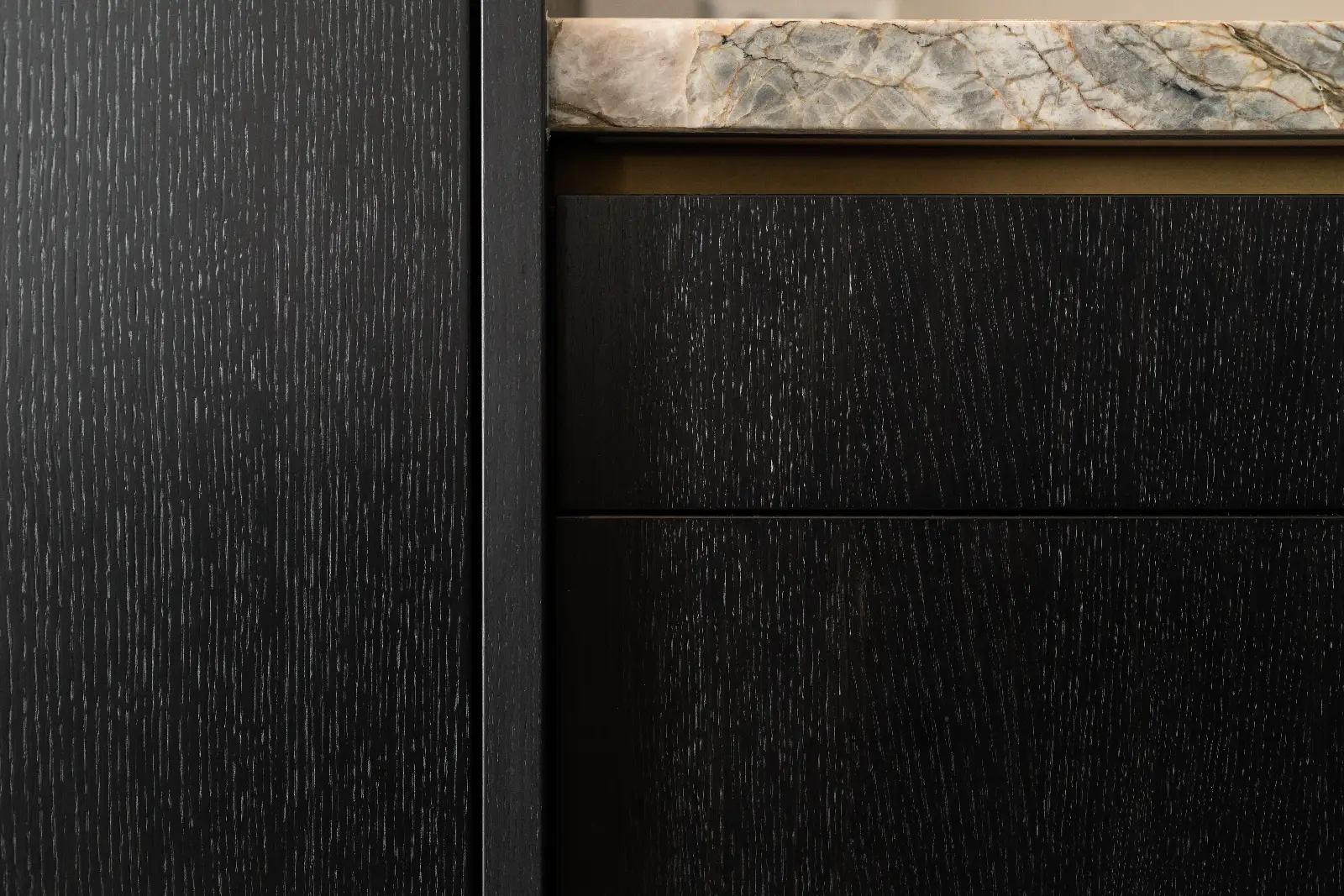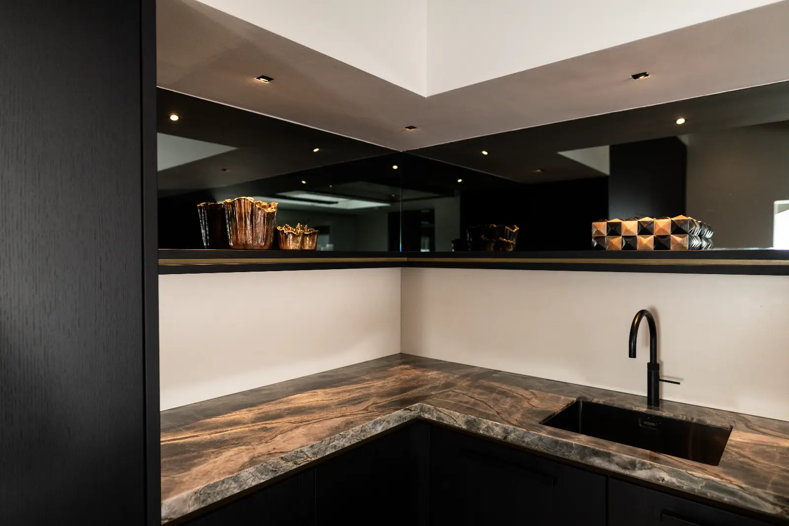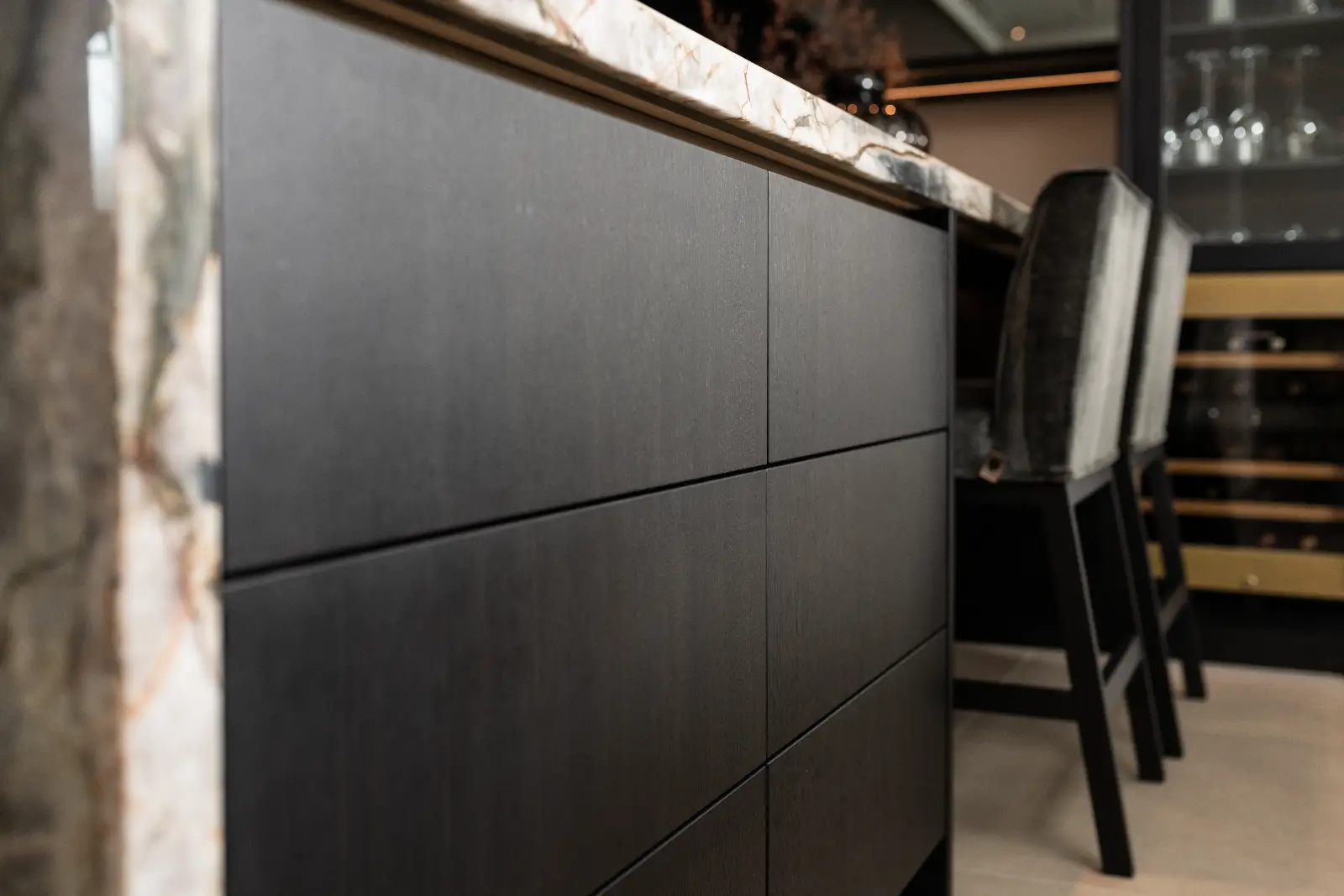 In dit project stond hoogwaardige apparatuur centraal. In de keuken met schier kookeiland moest koken een beleving zijn. Daarom is gekozen voor de nieuwste technologieën van onder andere Gaggenau, Quooker en Liebherr. De keuken is uitgerust met een stoomoven, bakoven, vacumeerlade en een wijnklimaatkast. Alles is uitgevoerd in gespoten messing voor een luxe uitstraling en maximale functionaliteit.