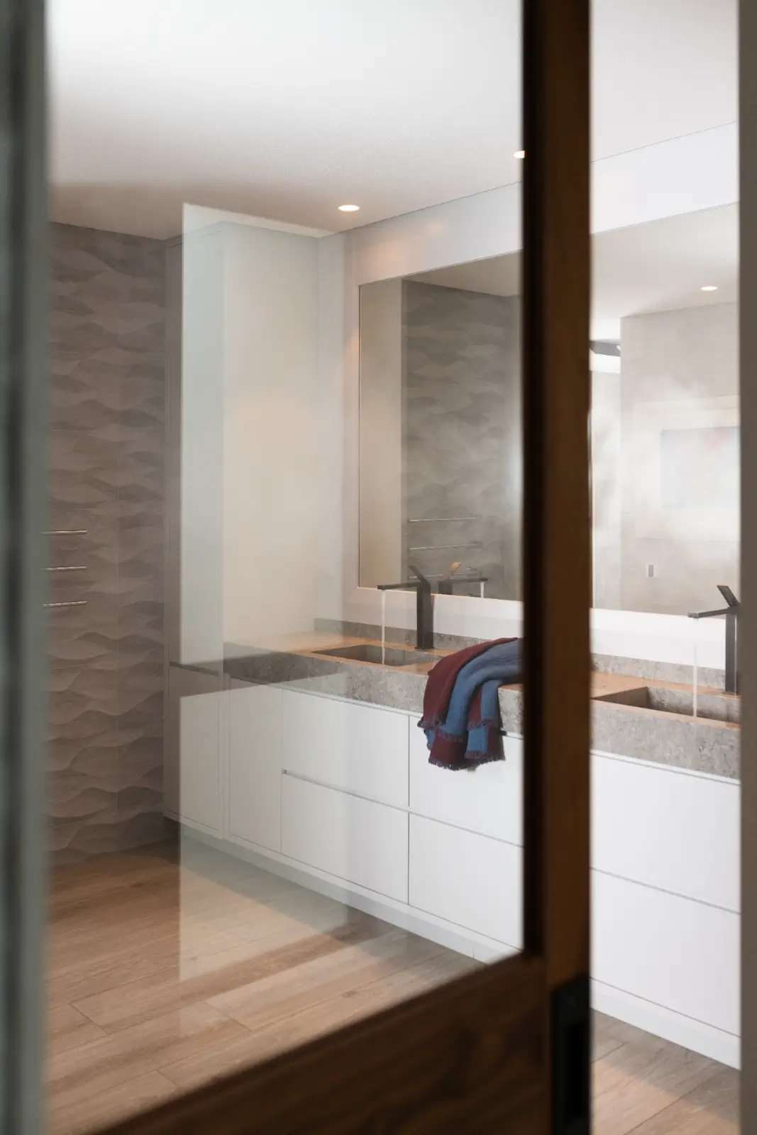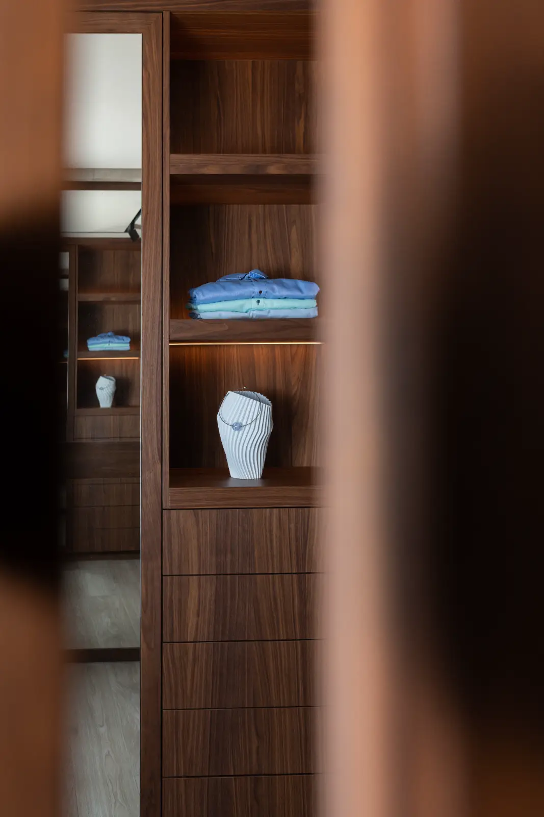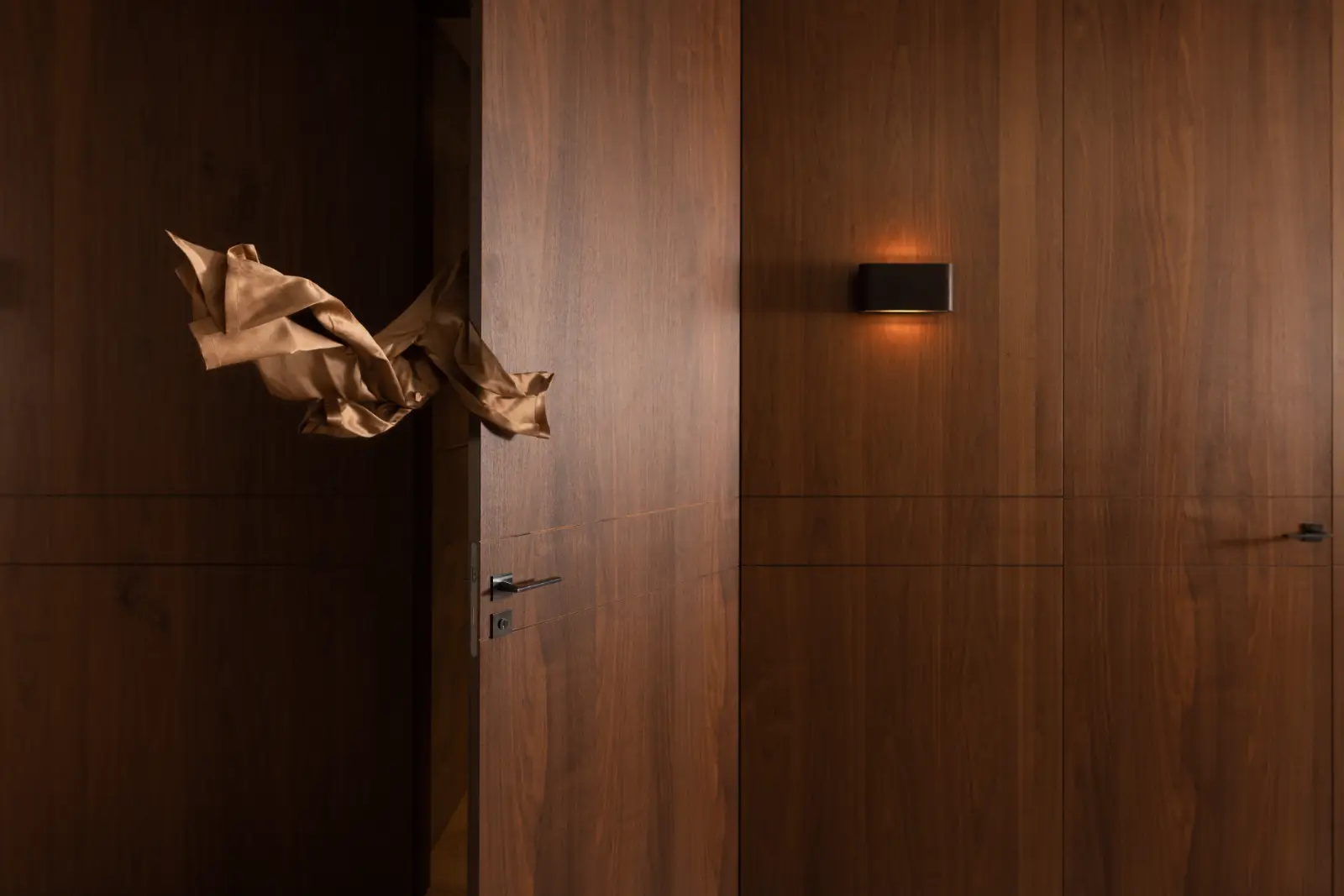 De lange wand in de entree is uitgevoerd in Amerikaans walnoot fineer, waarin met massief notenhout de belijning van de schuif- en taatsdeuren is doorgetrokken. De donkere kleur loopt door naar de vloer en de achterwand van de keuken en komt terug in het eetgedeelte, wat een perfecte eenheid creëert tussen de verschillende ruimtes.