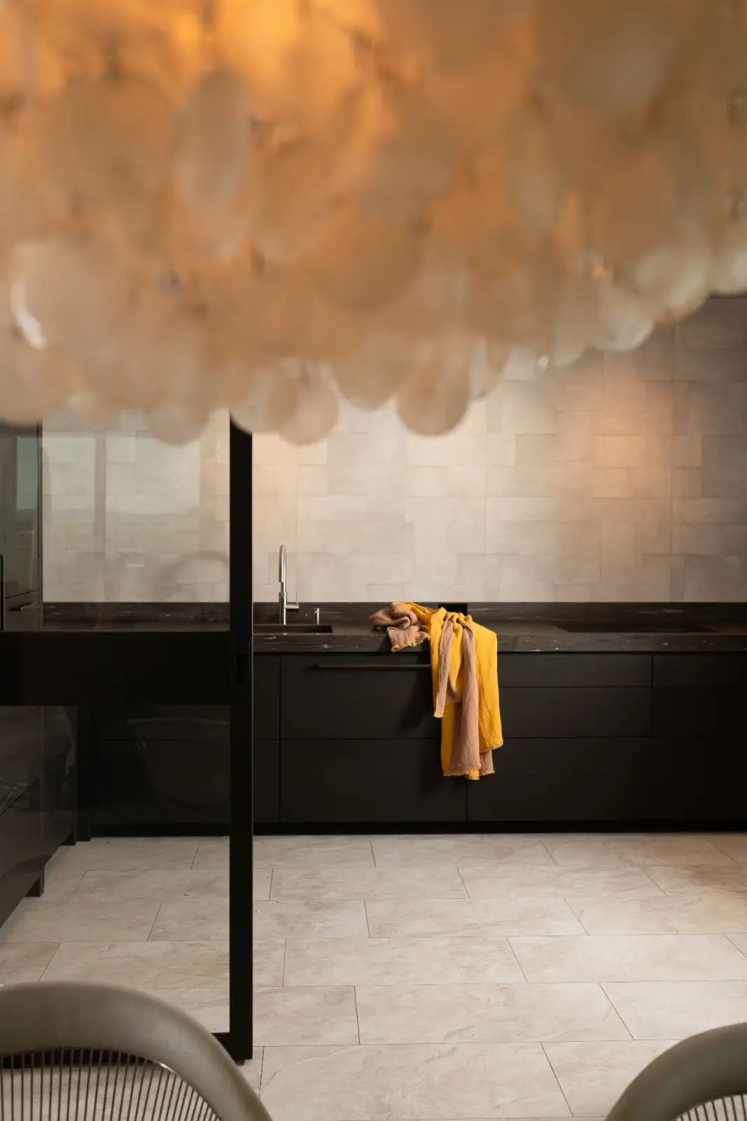 Luxueuze donkere keuken die wegsmelt in interieur